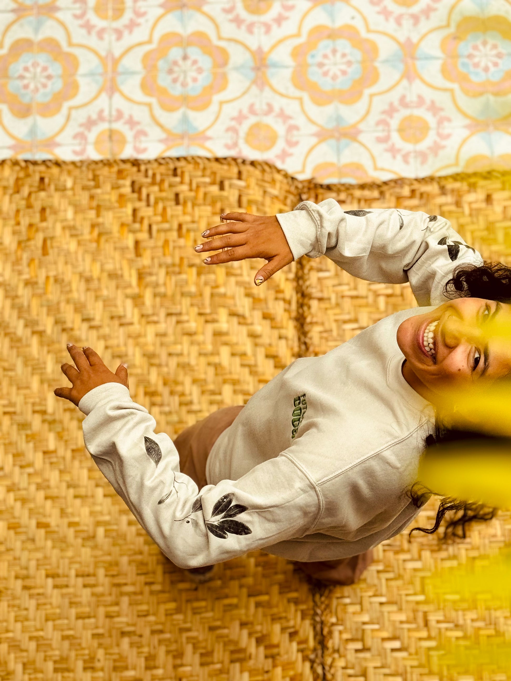 Buzo beige estampado en mangas y bordado en pecho